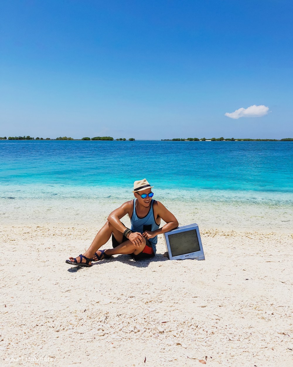 WHO SAYS YOU CAN’T NETFLIX AND CHILL BY THE BEACH? We were exploring the island when we saw this TV on its shore. Dismissing the question on how it ended up there, I just saw a chance on what to do with it. Imagine having this TV on a far away island with no electricity, no potable water supply, no food, and most importantly, no inhabitants, what would you do? I thought it would be fun to take a photograph with it along the island’s tremendously white beach and alluringly azure waters!